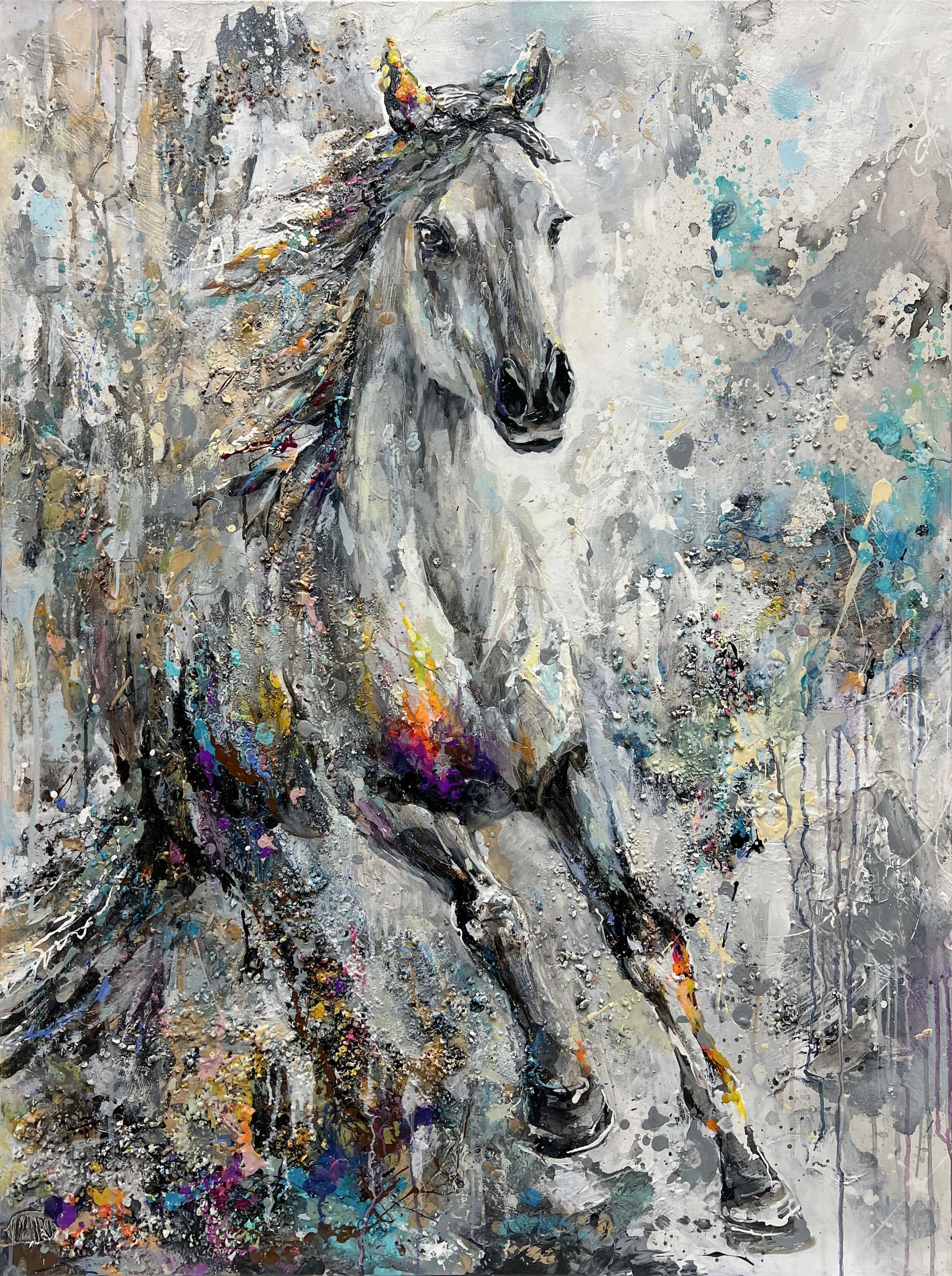 Her work captures the resilience and ephemerality of the natural world as it evolves and changes, creating a narrative suspended in time. Miri developed her distinctive style by combining a spontaneous and free application of paint, drips, smears, scrapes, and spills with a vibrant and rich palette. Her fascination with the materiality of art and nature has led to the incorporation of sand, stones, and other materials to add depth to her paintings. Her unparalleled ability to capture emotion and movement using texture and brushstrokes brings each of her creations to life. The piece is only truly resolved and complete once it feels as if the painting can breathe on its own.